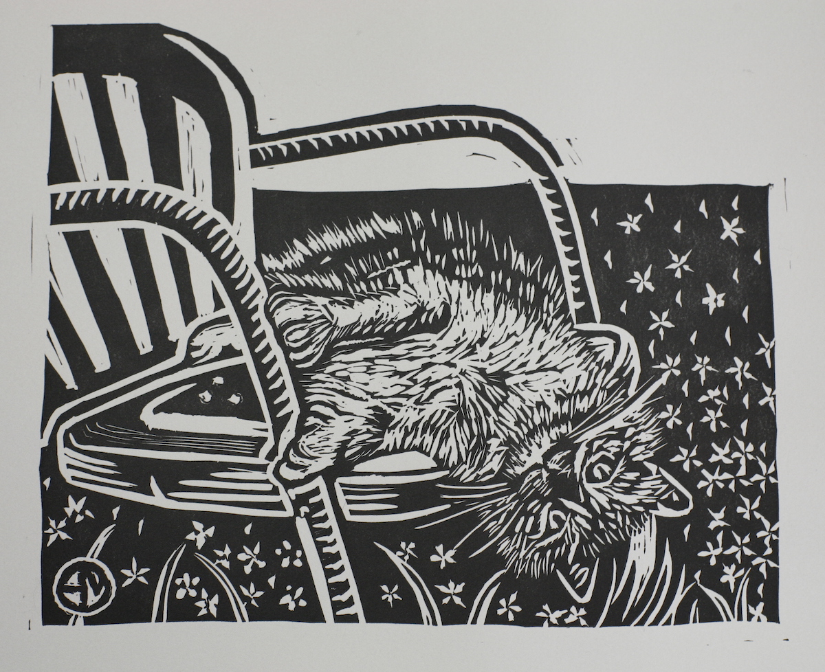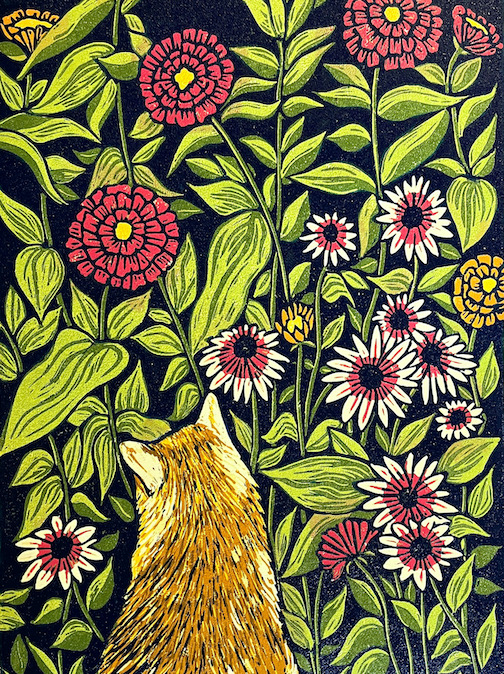 Yellow Tabby in the Garden, 8”x12” 8 Color reduction print, Edition of 18, 2025