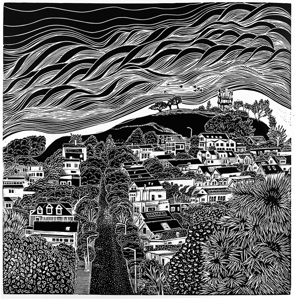 Karl the Fog over Bernal Hill, 18”x18” Linoleum Blockprint, Edition of 20, 2025