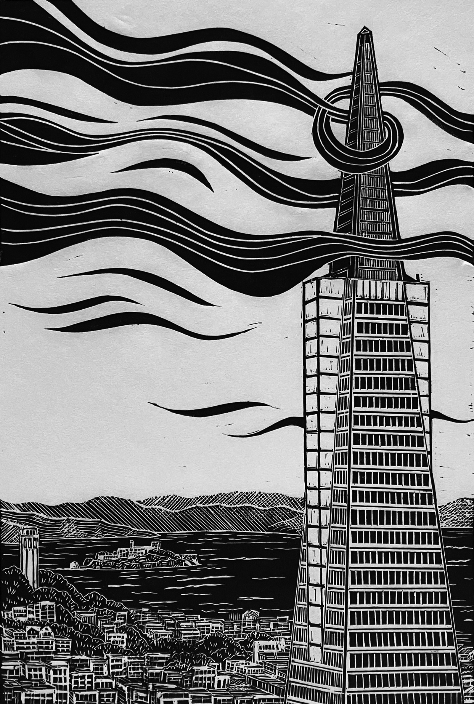 Kissing the TransAmerica, 8”x12” Linoleum Blockprint, Edition of 20, 2025