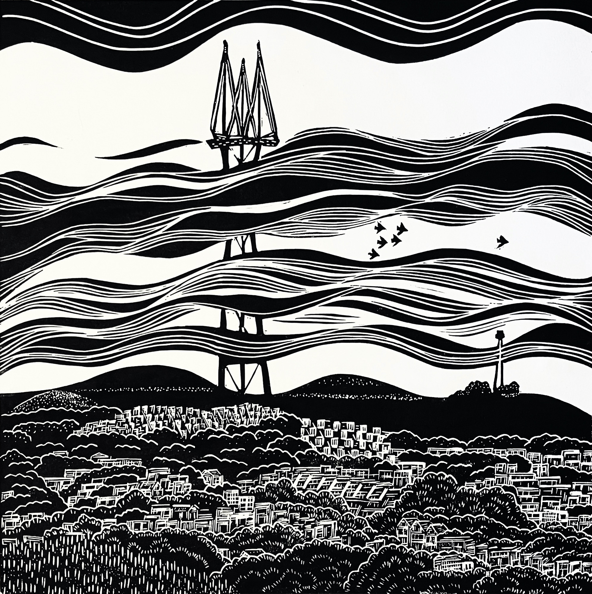 Sailing Sutro, 12”x12” Linoleum Blockprint, Edition of 20, 2025