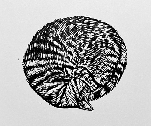 Sleeping Tabby, 3”x3” Linoleum Blockprint, Edition of 25, 2025